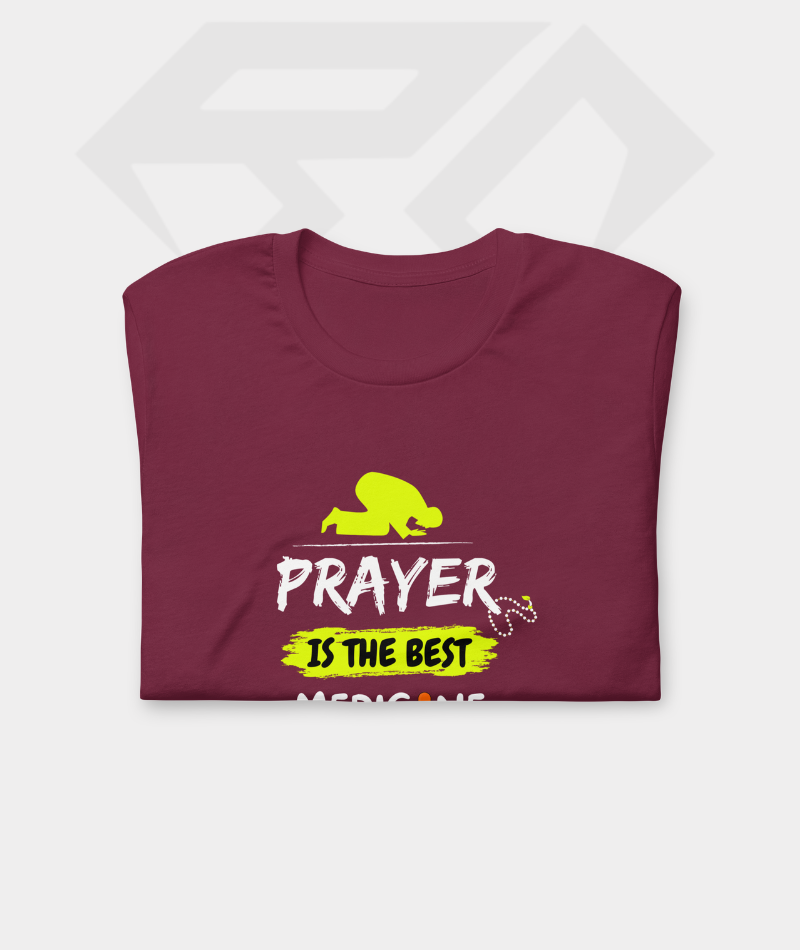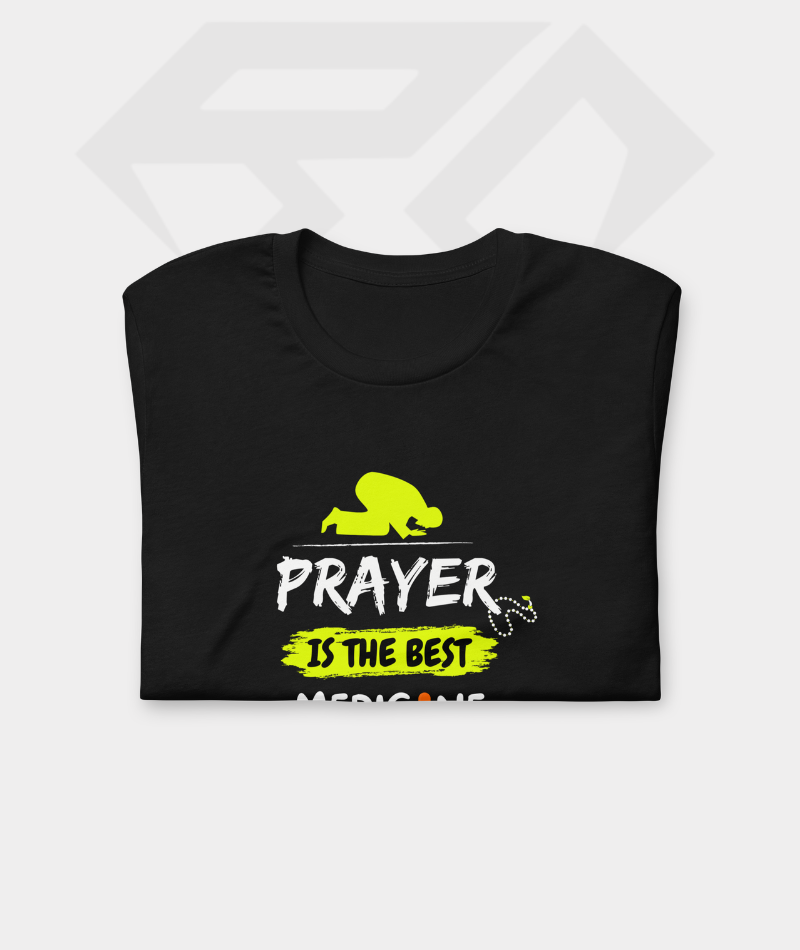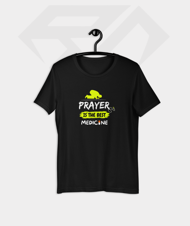 Premium half sleeve T-shirt featuring the “Prayer Is The Best Medicine” quote. Crafted from high-quality 180 GSM cotton for breathable comfort and everyday wear.
