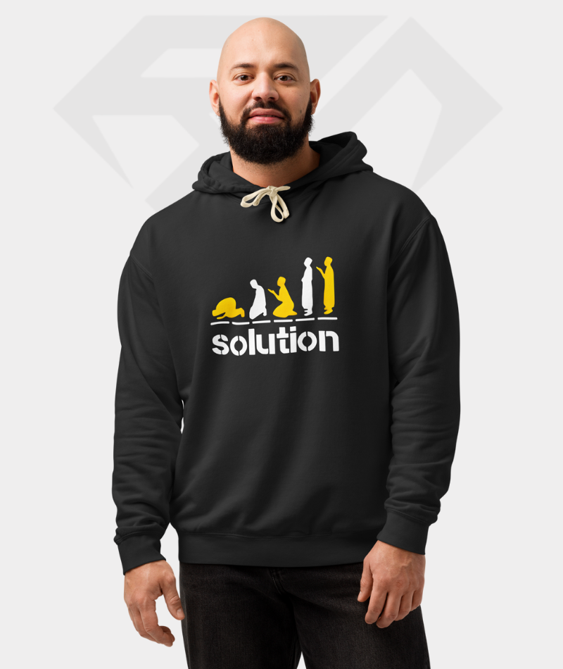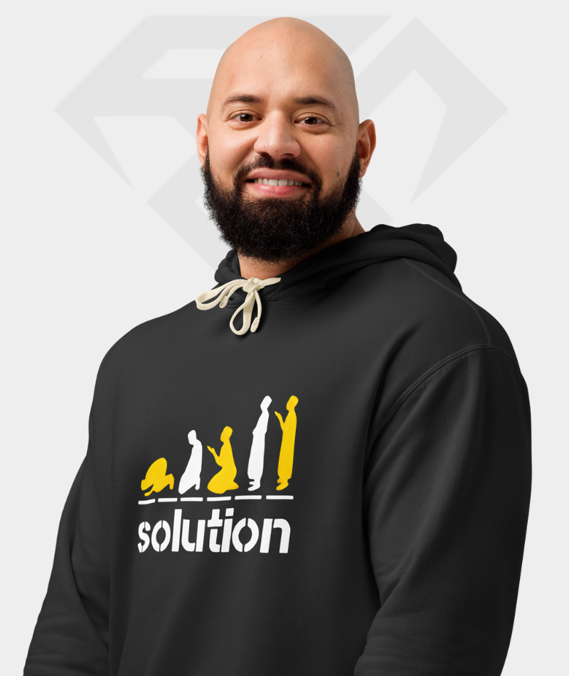 Premium hoodie featuring the powerful “Solution” quote. Made from heavy 350 GSM cotton fleece with a double-layer hood for lasting comfort and warmth.