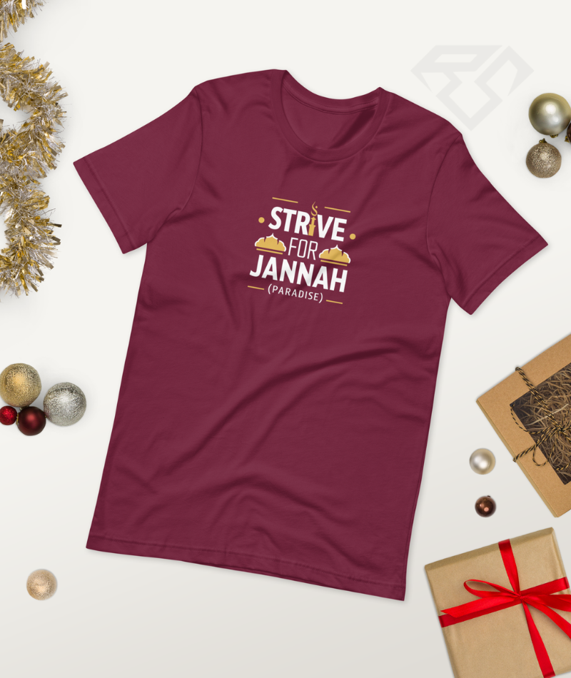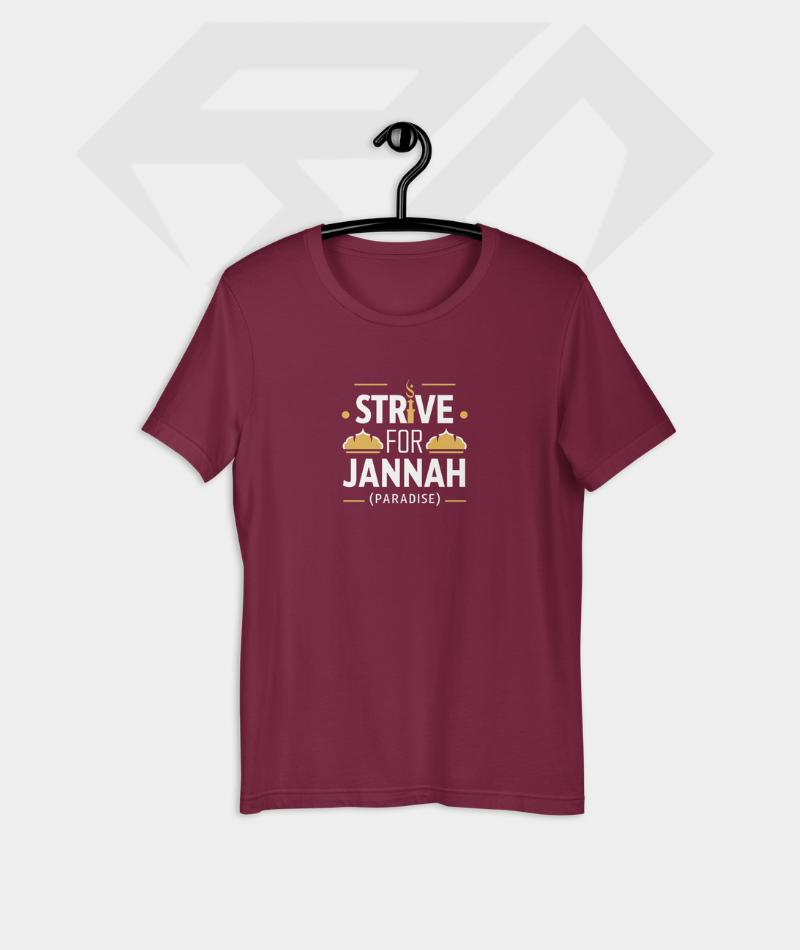 Premium half sleeve T-shirt featuring the “Strive For Jannah” quote. Crafted from high-quality 180 GSM cotton for breathable comfort and everyday wear.